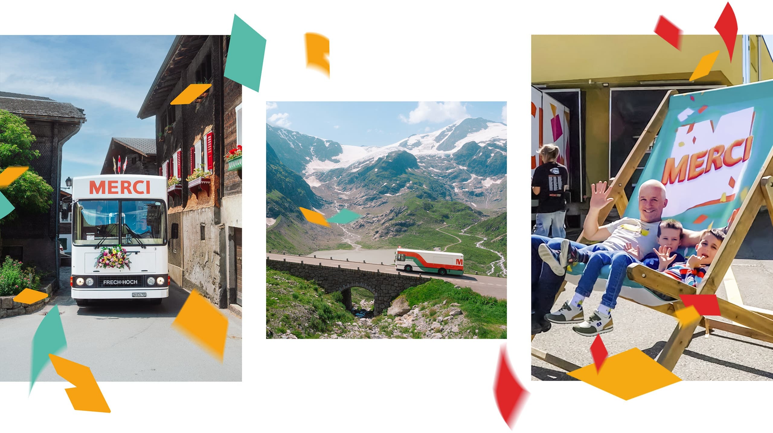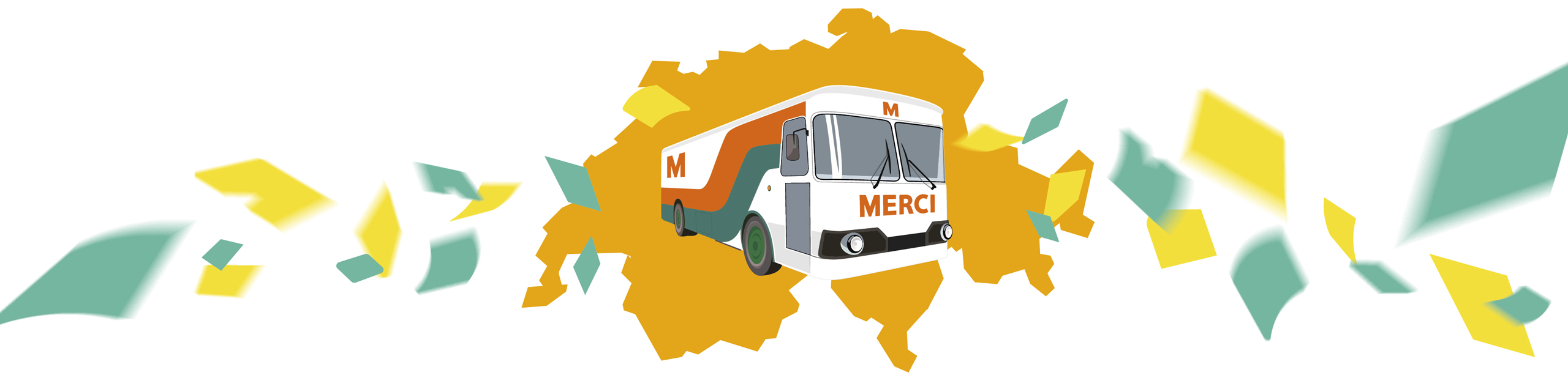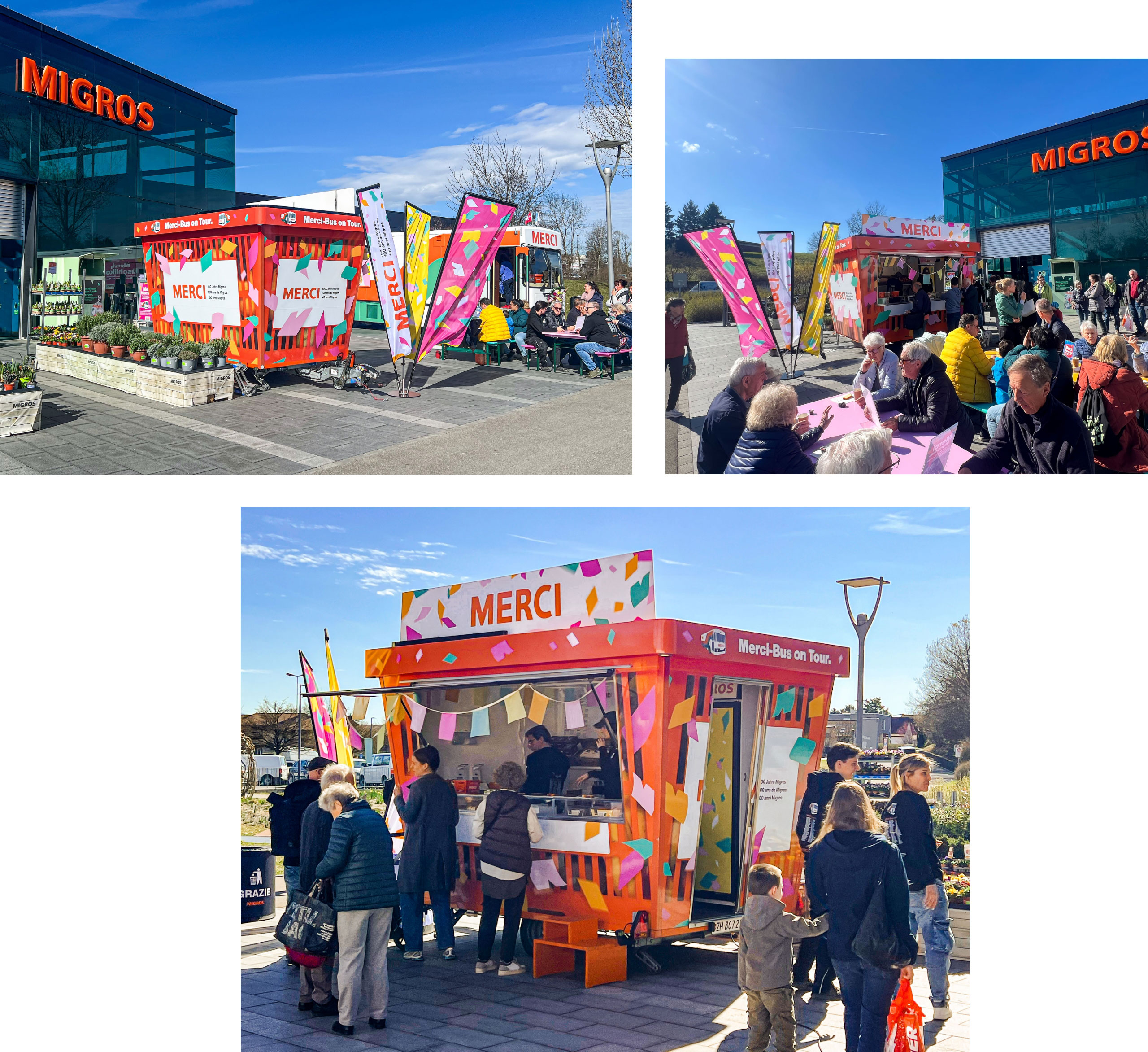 Der Merci-Bus bedankt sich dort, wo die Migros zuhause ist: vor Ort in 100 Gemeinden von Avenches bis Zumikon. Im Gepäck hat er jene Produkte, die in jeder Ortschaft besonders beliebt sind, vom Butterzopf über den Cervelat bis zum Ice Tea. Vor Ort gab es nicht nur das Lieblingsprodukt der jeweiligen Gemeinde als Geschenk, sondern auch Kaffee, Kuchen, Äpfel und Sirup für die Kleinen. Im alten Migros-Bus konnten die Besucher ein kleines Sortiment entdecken und wie früher einkaufen.