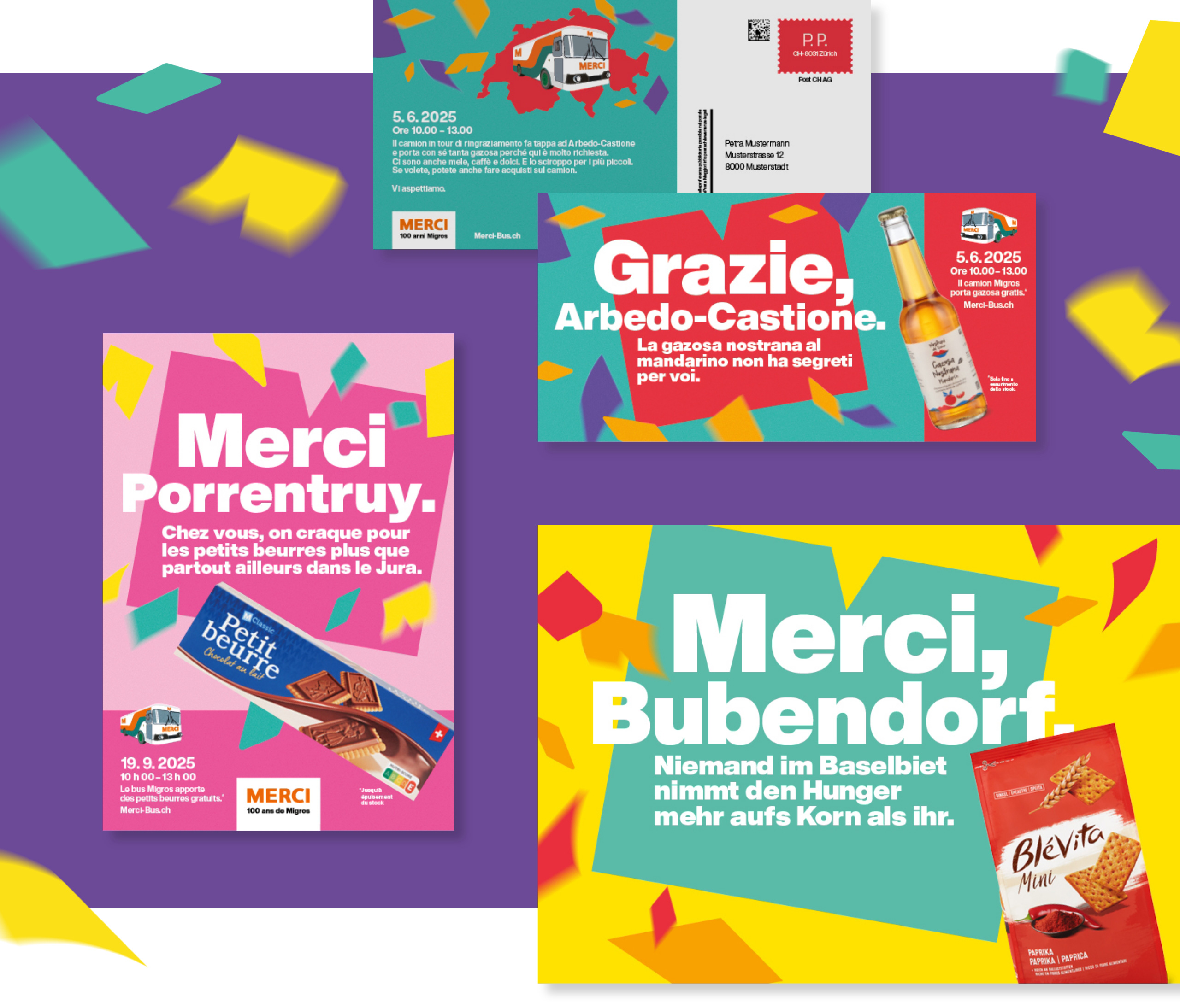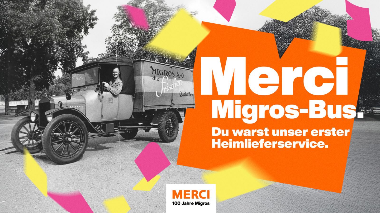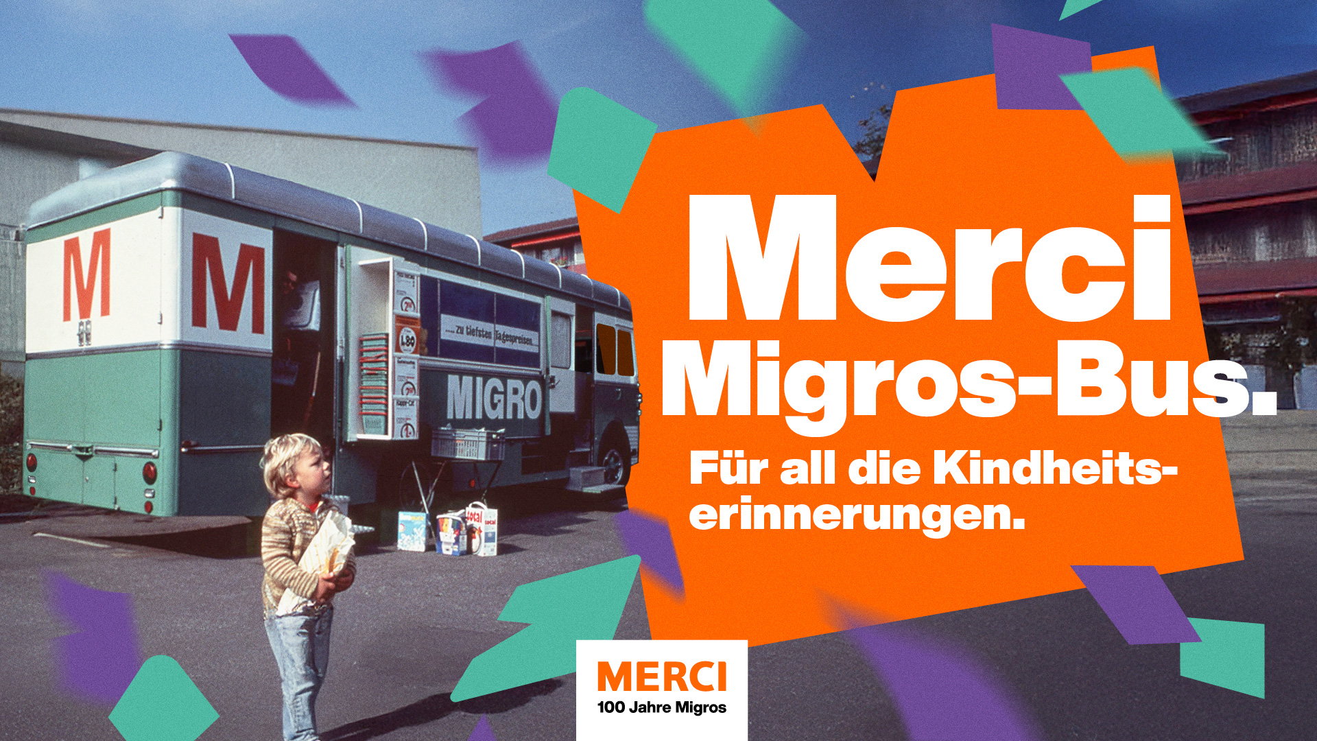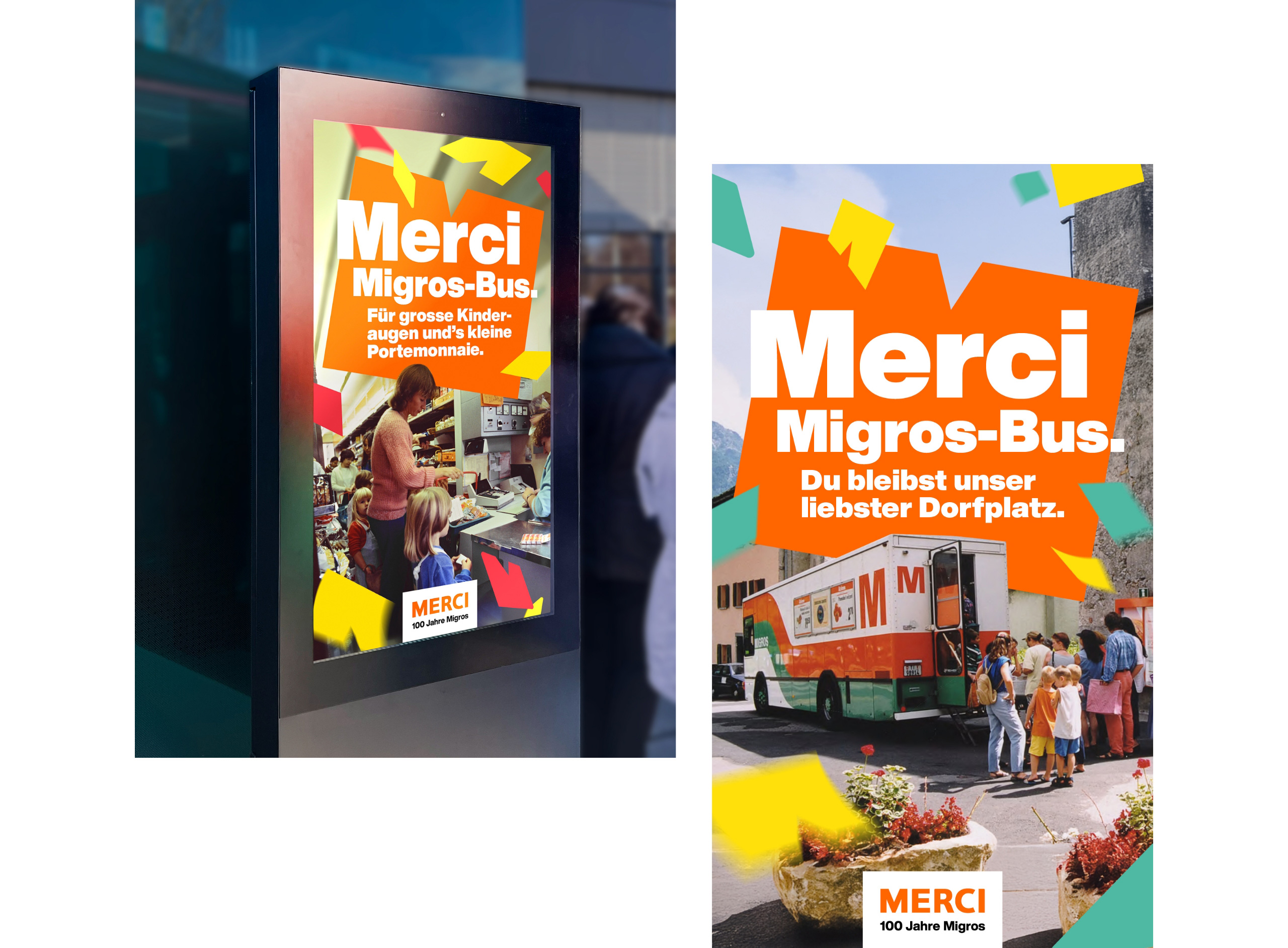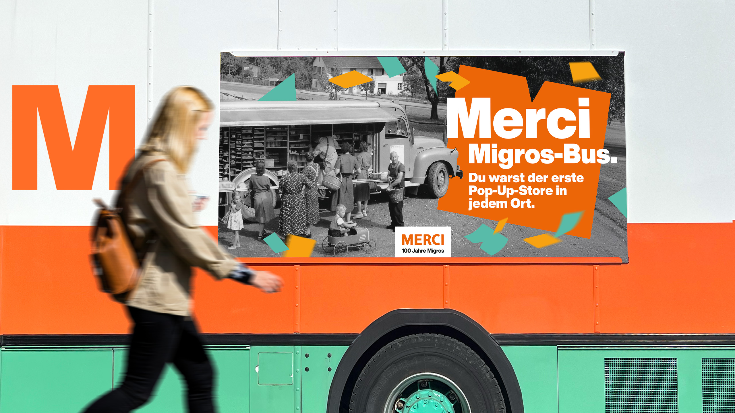 Markenauftritt und Kampagne für die Jubiläumstour des Migros-Merci-Busses durch 100 Gemeinden.