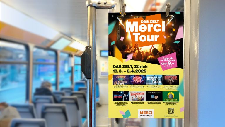 Die Migros feiert ihren 100. Geburtstag mit der «Merci Tour» und fördert Kultur wie seit 1957. Gemeinsam mit der mobilen Kulturbühne DAS ZELT bietet sie neun Shows in fünfzehn Schweizer Städten an. Über 250’000 Tickets kosten symbolisch nur neun Franken, entsprechend dem Preis einer Theaterkarte in Zürich vor 100 Jahren.