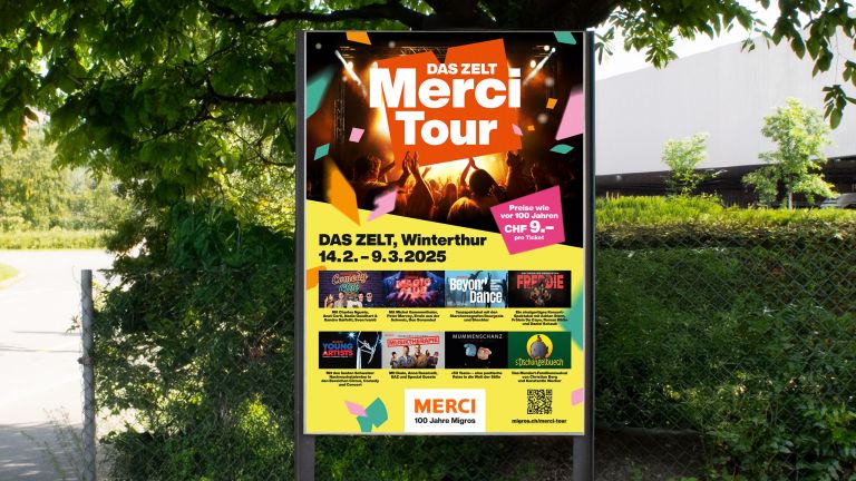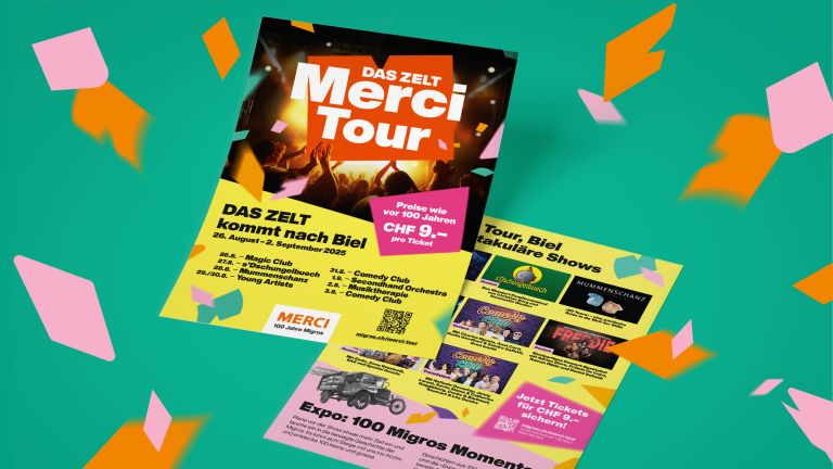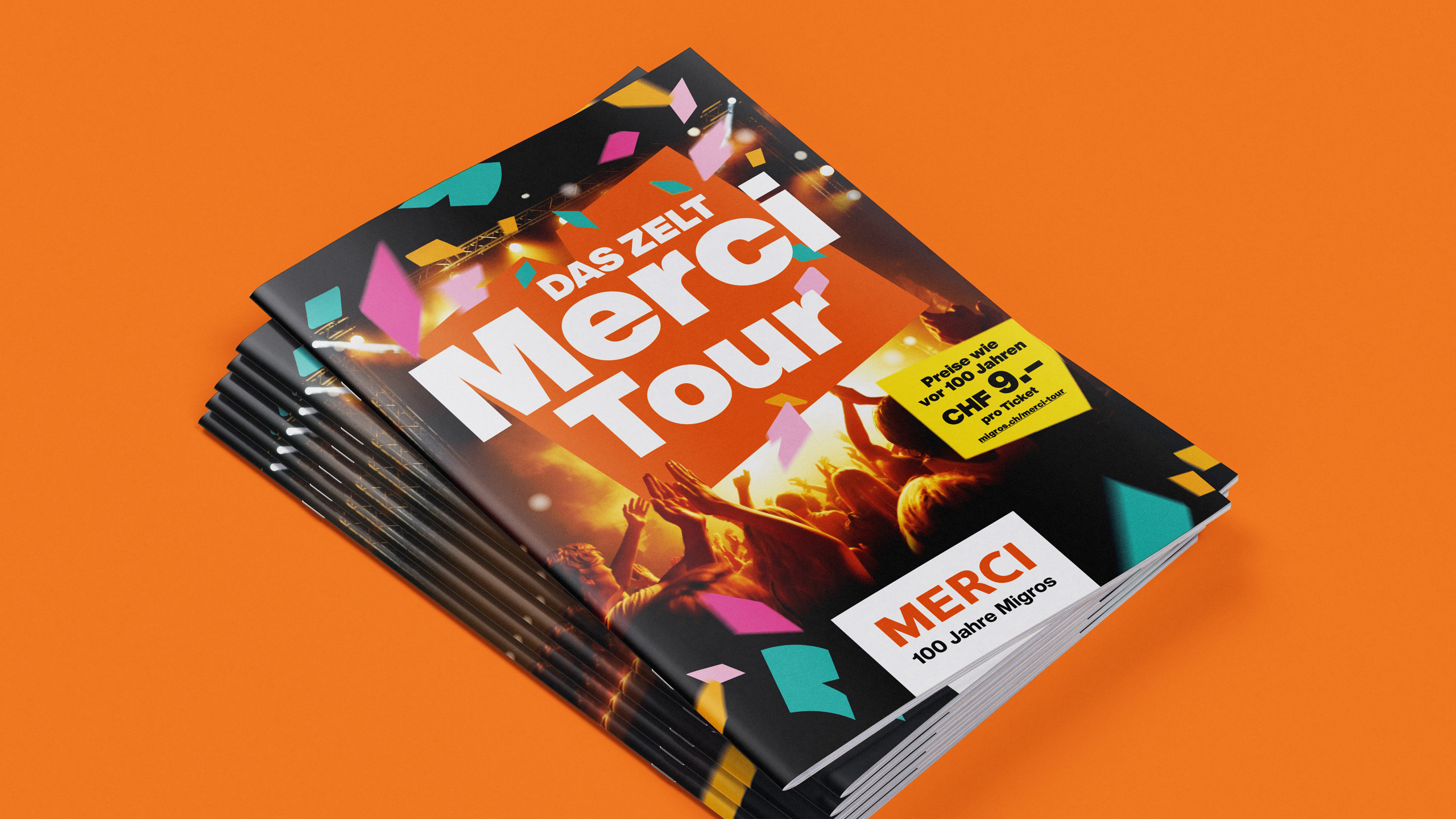Im Rahmen der M100-Kommunikation haben wir den Auftritt und die Kommunikationsmassnahmen für die Merci-Tour umgesetzt, vom Keyvisual über die Kommunikationsmittel bis zur Gestaltung vor Ort. Die dreisprachige Kommunikation richtete sich gezielt an die deutsch-, französisch- und italienischsprachigen Regionen der Schweiz.