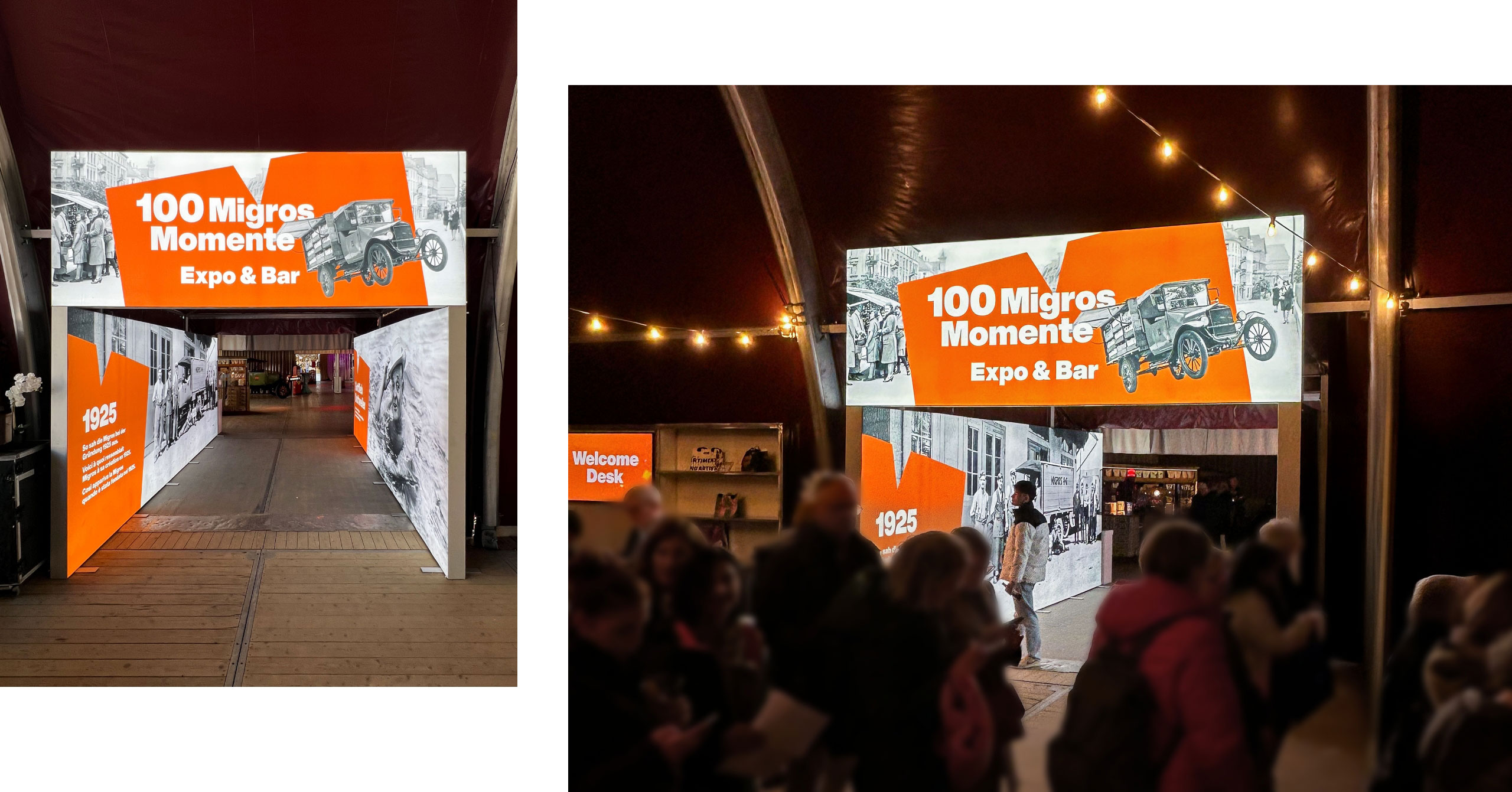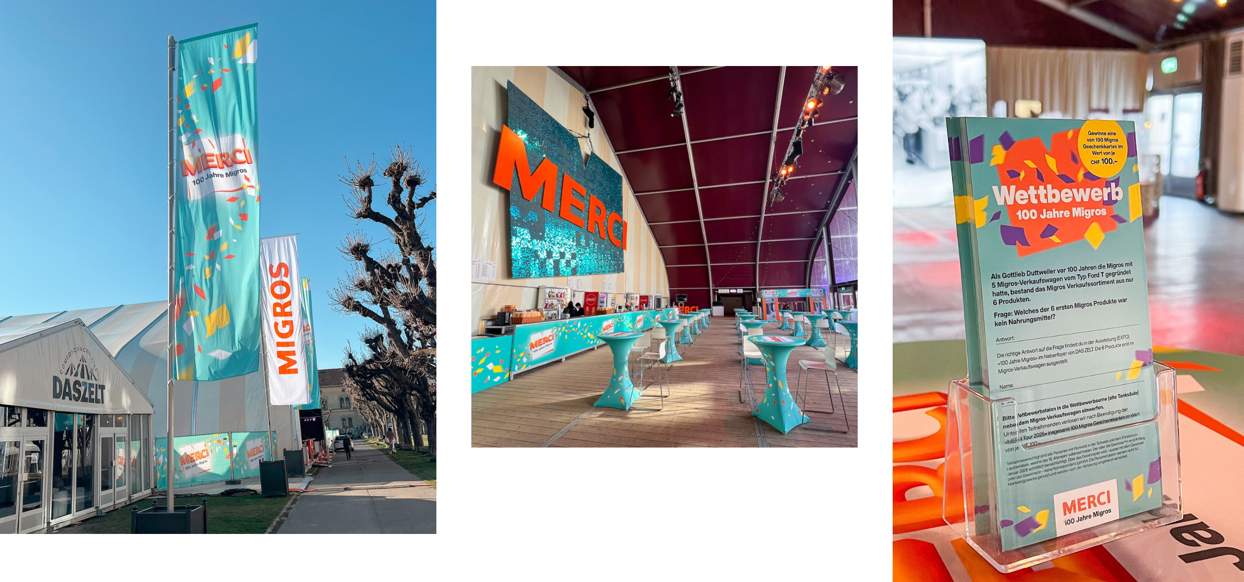 Auch die Gestaltung vor Ort wurde umgesetzt. Dazu gehörten Banner, Garderobe und Bargestaltung, Stehtisch- und Stuhlhussen, Tischdecken, Getränkebons, Tickets und Tickethüllen sowie die Eingangsgestaltung der Migros-Expo. Durch die umfassende Umsetzung vor Ort entstand ein stimmiges Gesamterlebnis, das die Besucherinnen und Besucher direkt in die Welt der Merci-Tour eintauchen liess.