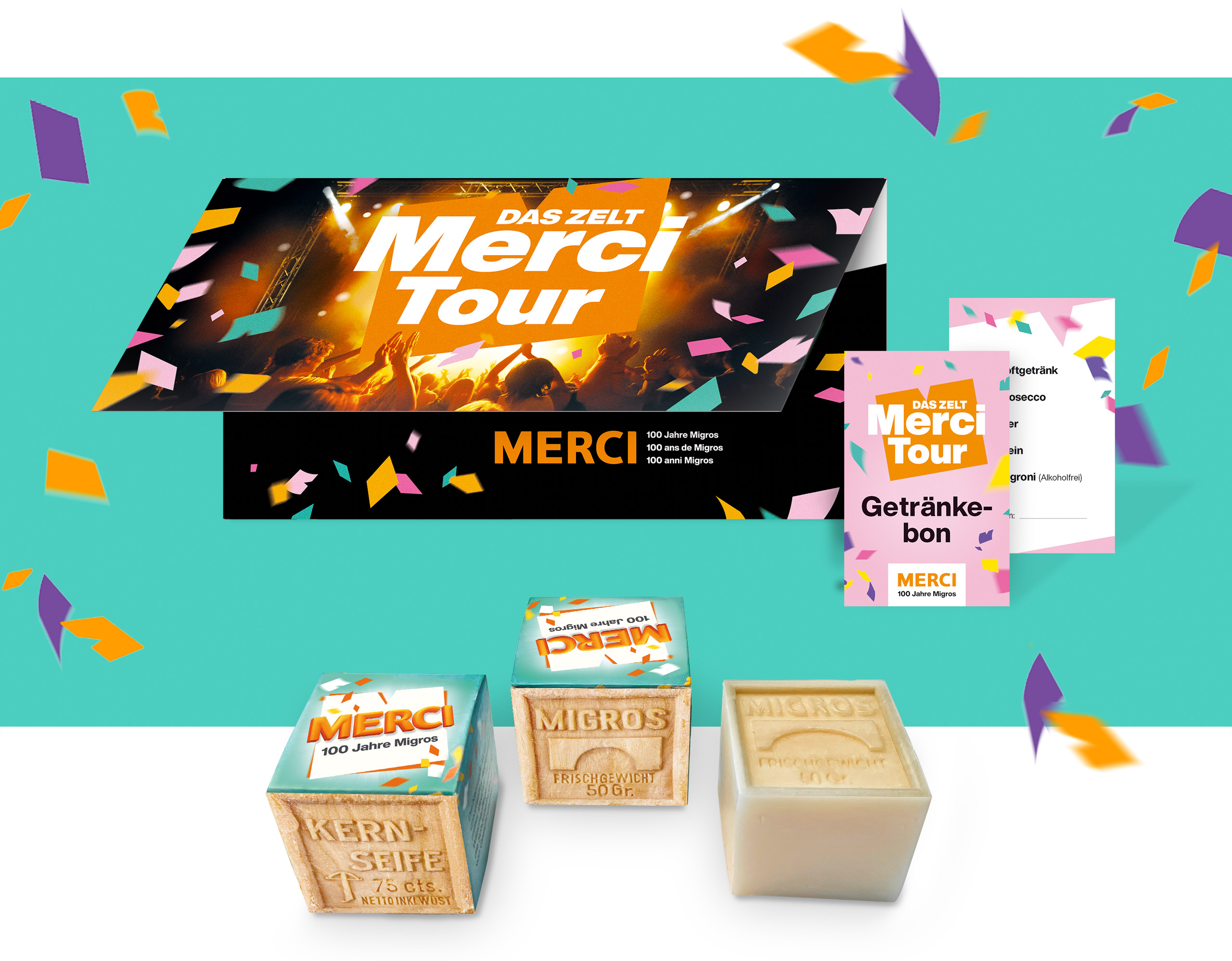 Markenauftritt und Kampagne für die schweizweite Migros Merci-Tour anlässlich von 100 Jahren Migros.