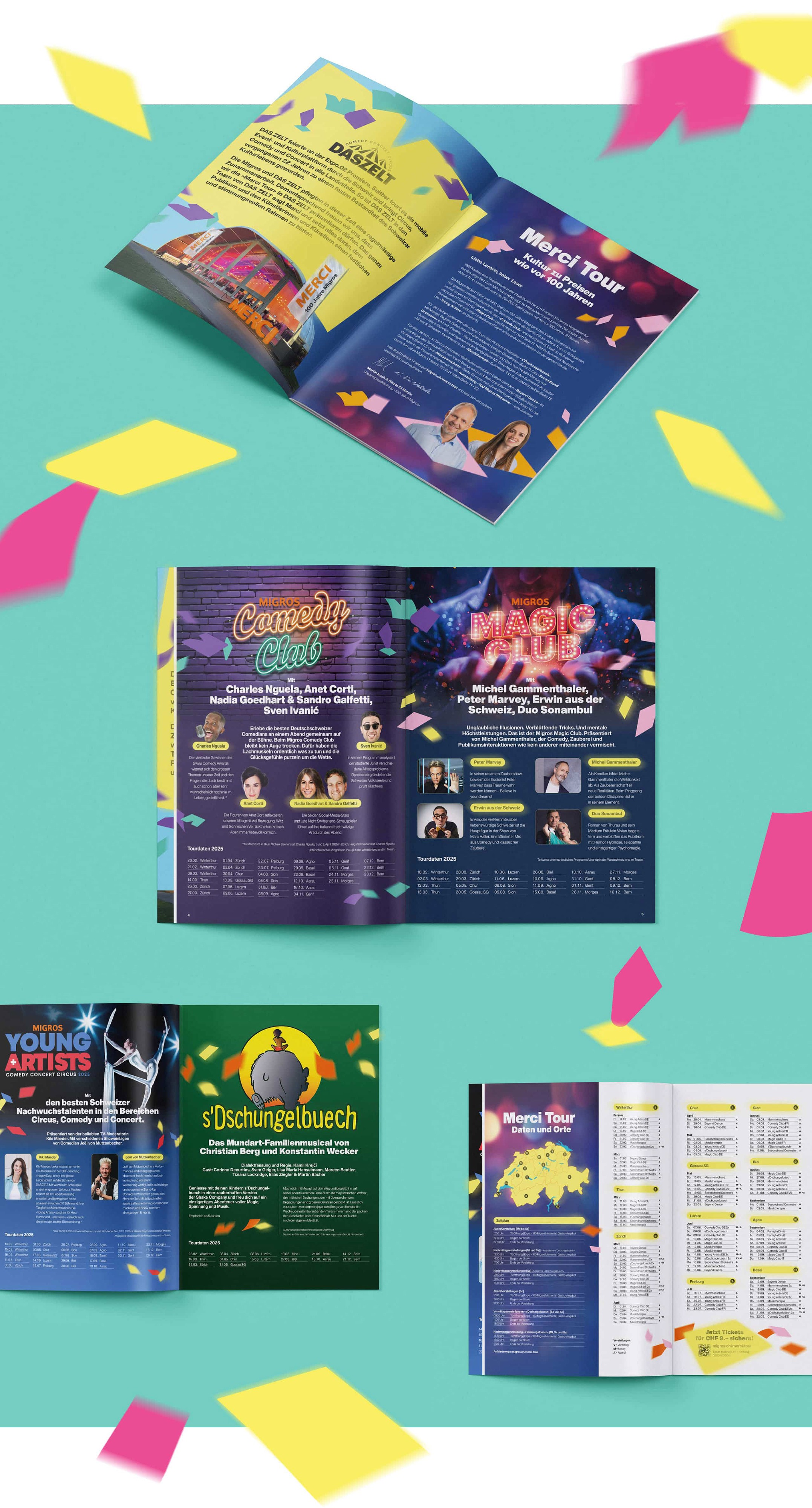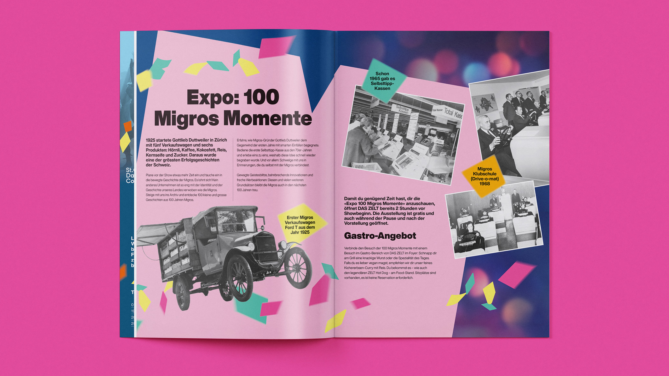 Im Programmheft haben wir sowohl inhaltlich als auch visuell die Shows in Szene gesetzt. Es enthält alle wichtigen Informationen zu den einzelnen Veranstaltungen, zum kulinarischen Angebot, zur Migros-Expo sowie zum vollständigen Veranstaltungsplan.