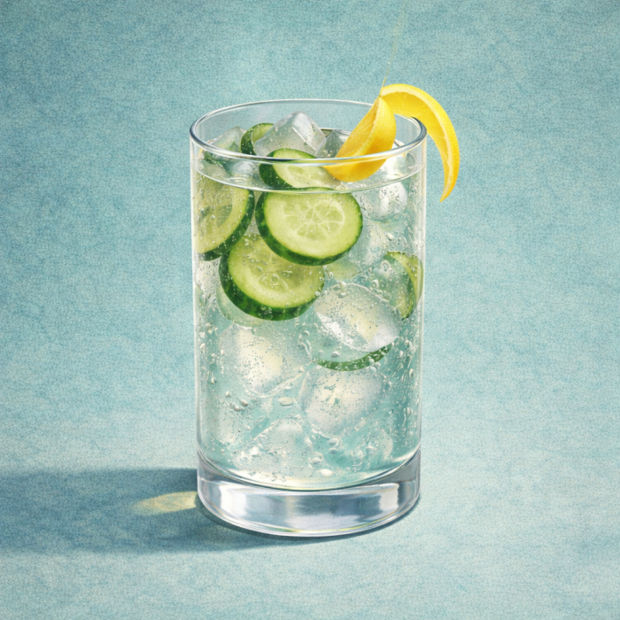 Glas mit Eis füllen, Gurke dazu, Tonic einfüllen. Zitronenzeste leicht ausdrücken.