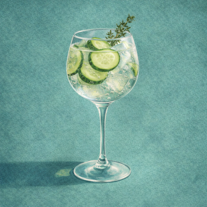 Gin und Eis ins Glas, mit Tonic auffüllen. Gurke und Thymian ins Glas geben.
